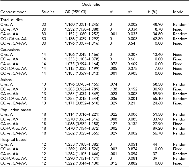 aThe pooled p value; b p value for heterogeneity test; crandom-effect model; dfixed-effect model.
