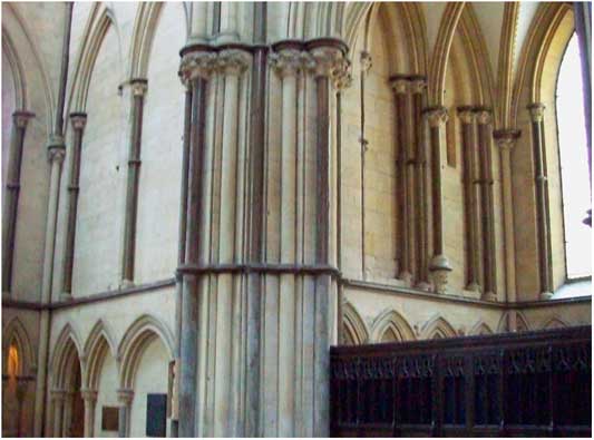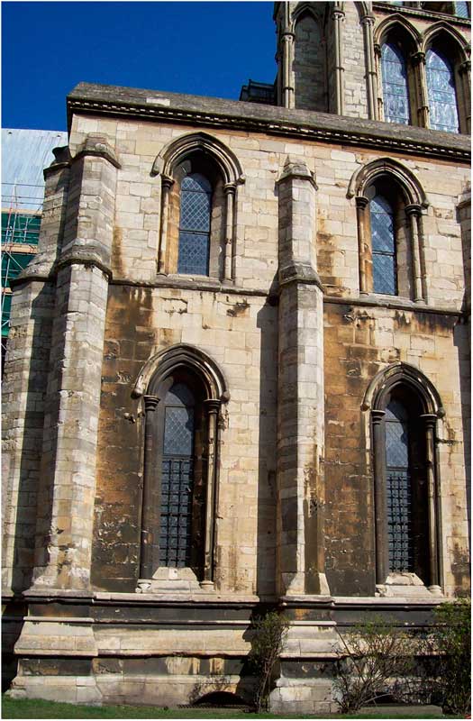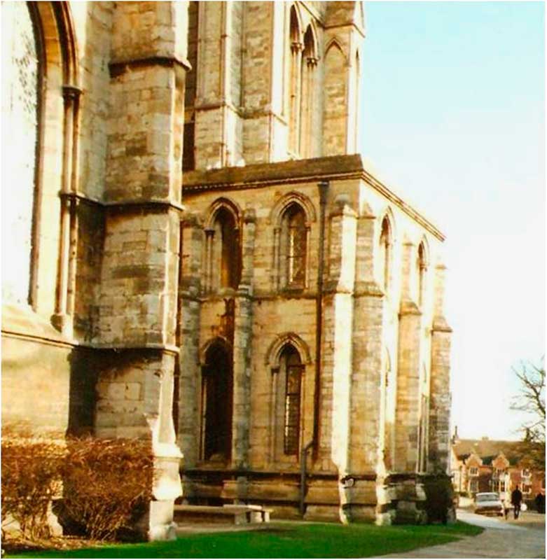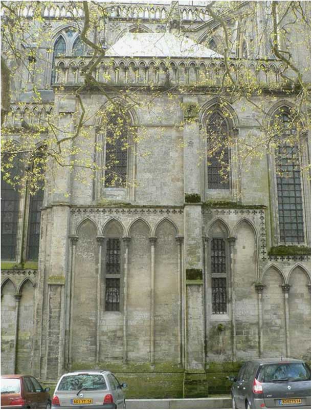 Fig 6 The south and west walls of the south-eastern transept of Lincoln Cathedral, behind which lies the treasure house. Photograph: © author