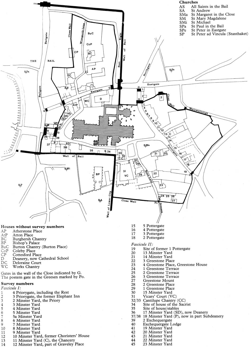 Fig 2 Plan of Lincoln Cathedral and its Close, with the location of the sacrist’s house (34) ‘lying to the south of the cathedral’s treasury’. Source: Jones et al Reference Jones, Major and Varley1987, 74–5