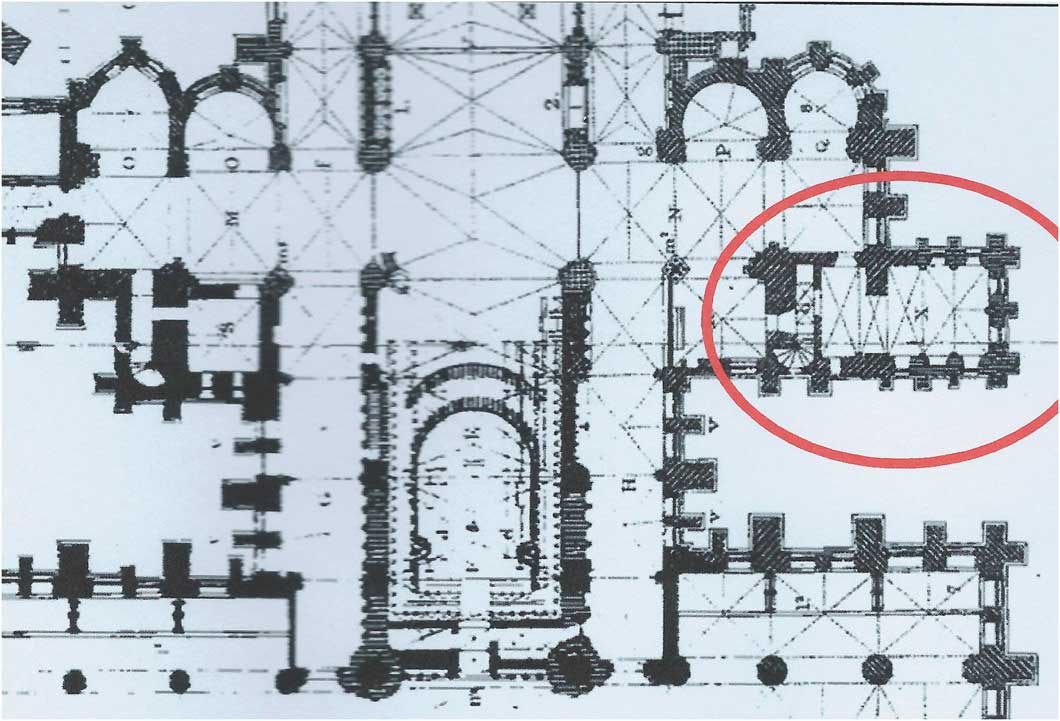 Fig 3 Plan of Lincoln Cathedral choir and east transepts, showing the location of the treasure house. Source: The Builder 1892, 61, no. 2544