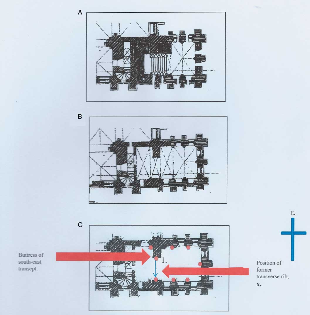Fig 4 Lincoln Cathedral treasure house: (A) plan of the crypt; (B) the lower chamber; and (C) the upper chamber, showing the position of the corbel heads that formerly carried the vaulting ribs. Drawing: The Builder 1892, 61, no. 2544, adapted by the author