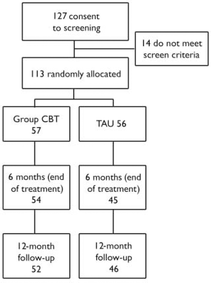 Of 127 people who consented to being screened for eligibility, 113 (89%) fulfilled inclusion criteria and were recruited into the study; ten CBT groups were conducted (Fig. 1).