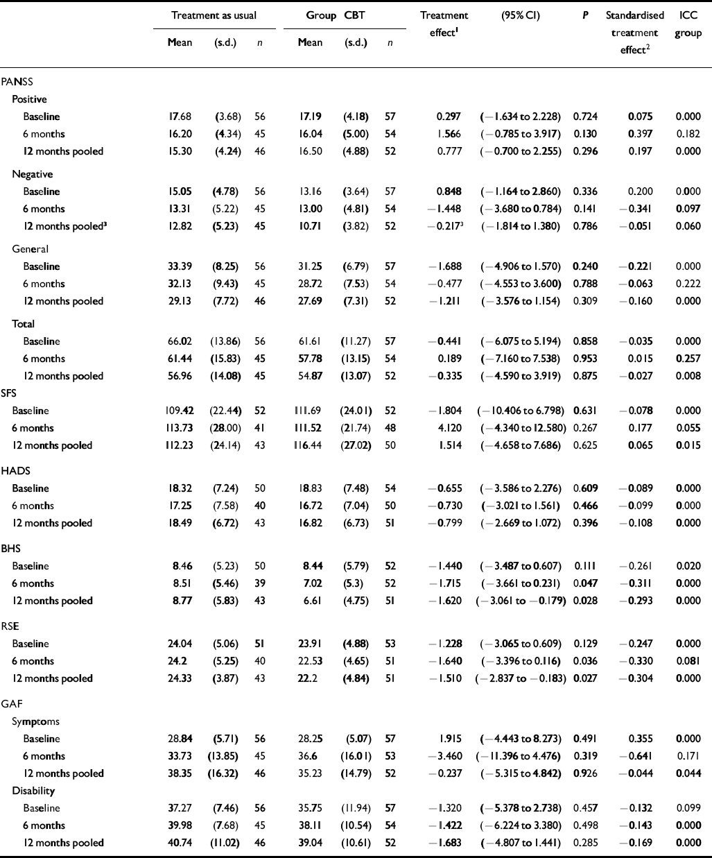 | Treatment as usual | Group CBT | Treatment effect1 | (95% CI) | P | Standardised treatment effect2 | ICC group | |||||