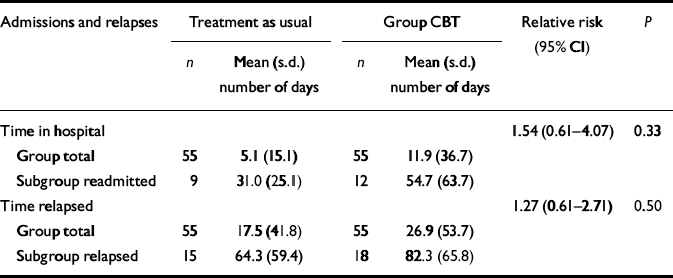 | Admissions and relapses | Treatment as usual | Group CBT | Relative risk (95% CI) | P | ||