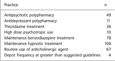 The levels of antipsychotic polypharmacy are typical of community settings (Reference StahlStahl, 2000). High-dose antipsychotic use was relatively infrequent. Intramuscular antipsychotic doses were relatively low and might relate to the high rates of supplementation with oral antipsychotic agents. Routine prescribing of anticholinergic medications was particularly common in those receiving intramuscular antipsychotic preparations. In view of these findings, and the less overall judicious prescribing in patients receiving intramuscular agents, this group has been prioritised for medication management in the coming year.