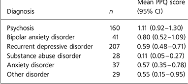 | Diagnosis | n | Mean PPQ score (95% CI) |