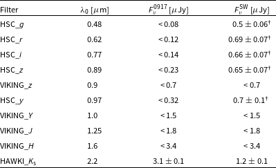We also compiled publicly available data on GLEAM J0917–0012, from optical to radio wavelengths. After visual confirmation of a non-detection in the images, we report additional upper limits from the Herschel Space Observatory (hereafter, Herschel Pilbratt et al. Reference Pilbratt2010), the Widefield Infrared Survey Explorer (WISE; Wright et al. Reference Wright2010), and the Hyper Suprime-Cam Subaru Strategic Program (HSC; Aihara et al. Reference Aihara2018). The HSC survey covers our source with the grizy bands, reaching significantly deeper than the VIKING survey (zYJHK) in the overlapping bands, thereby allowing for stronger constraints to be placed on the optical SED. We downloaded the HSC images and performed aperture-matched photometry at the source coordinates based on the detection and the resolution in $K_{\rm s}$ -band ( $\sim$ 0.7 arcsec; see D20). The flux densities and associated uncertainties are given in Table 2 along with all the limits from the VIKING survey and our previously reported $K_s-$ band detection (D20).