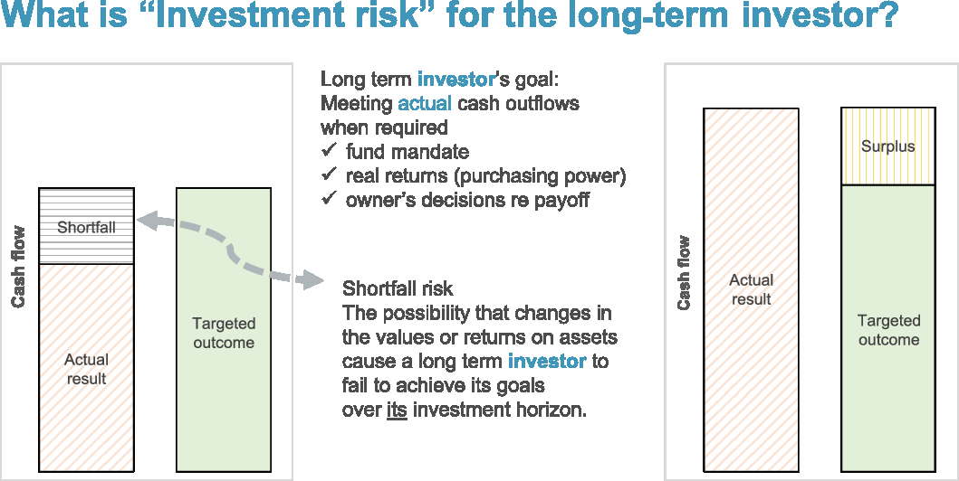 They are not present values or reserves on a balance sheet. They are just single cash flow amounts at a given point in future time. So, the green-shaded bars are the targeted outcome. On the charts on the left and right, the height of the green-shaded bars is the same, because this is one targeted outcome for one single point in time. On the chart on the left-hand side, that is the scenario where the actual result is less than the targeted outcome, so there is a shortfall generating shortfall risk. In the scenario on the right-hand side, the actual result exceeds the targeted outcome. So, in this case, there is not a shortfall but, in fact, there is a surplus.