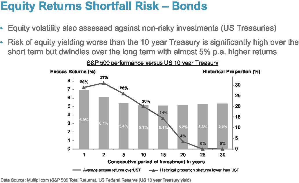 We have chosen S&P 500 as a representation of an equity investment portfolio as it is a globally recognised benchmark of well-diversified equities. In the chart, we have illustrated the S&P 500 annual total returns for various periods of investments, ranging from around 1 year to up to 30 years. The blue dots basically indicate the annual returns we have observed over the past century.