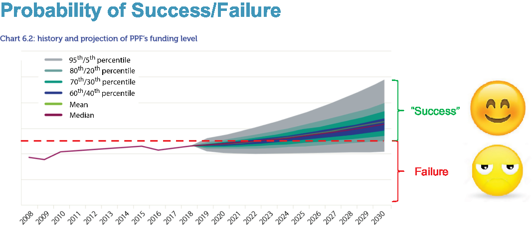 The final risk measure that I am going to talk about is the probability of success and failure. The paper refers to a case study on this topic, of how the PPF use this approach. This is where Figure 8 comes from. Essentially, here, the institution starts by defining what success means to them, and what failure means to them, and being clear on when that assessment needs to take place. So, when the PPF do their assessment, they measure success or failure at the end of this chart, at 2030. Essentially, they have a stochastic model that simulates the position of the entity. Scenarios above this red line would count as success, and scenarios below this would count as failure.