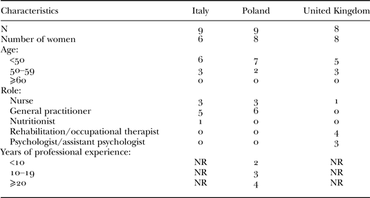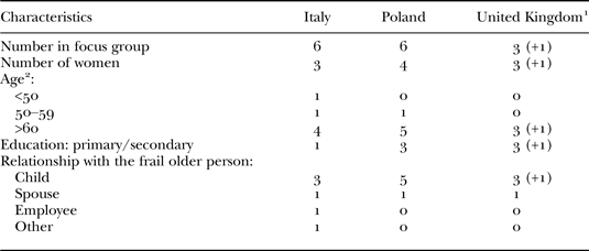 Participants’ characteristics are reported in Tables 2–6. Five focus groups were held in Italy and Poland, one per stakeholder group, six in the UK (two with older adults of mixed frailty status: two with health-care professionals, one with social care professionals and one with family carers) and four individual interviews (three older adults and one family carer) were held in the UK.