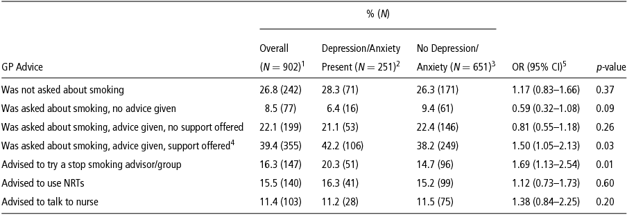 Linear and logistic regressions were used for the primary analysis to calculate the association between depression/anxiety status and GP advice and use of stop-smoking aids, adjusting for age, sex and social grade.