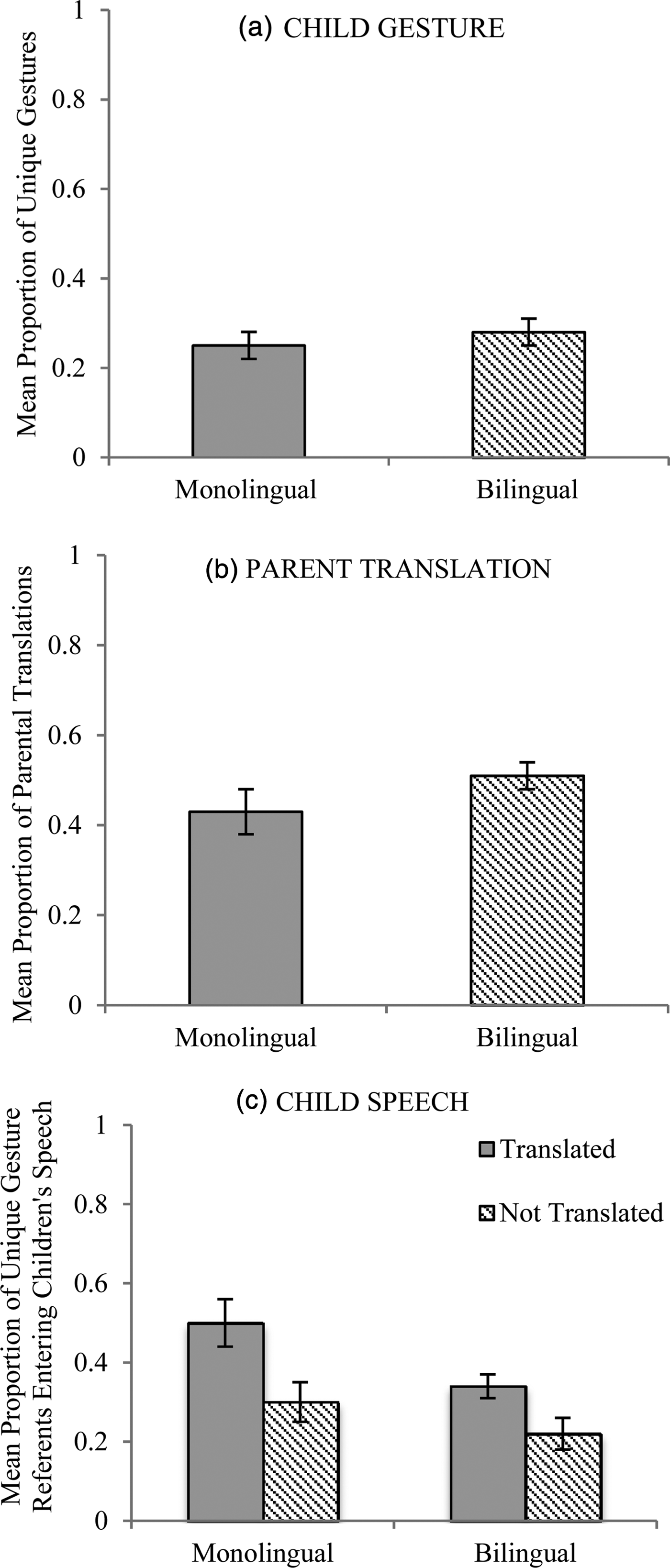 Figure 1. Mean proportion of referents children identified uniquely in gesture at 2;6 (panel A), mean proportion of unique child gestures parents translated into words at 2;6 (panel B), and mean proportion of unique gestures entering children's speech as words at ages 3;0–3;6 (panel C) for monolinguals (left bars) and bilinguals (right bars); error bars represent standard error.