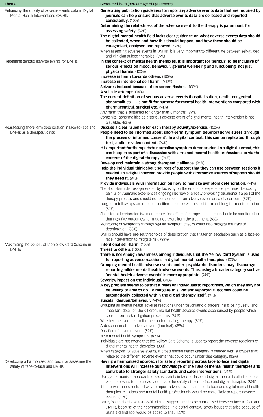 Under this theme, experts echoed researchers’ findings on the poor quality of adverse events data in DMHI studies.Reference Gómez Bergin, Valentine, Rennick-Egglestone, Slade, Hollis and Hall1 A total of 94% of experts agreed that ‘The digital mental health field lacks clear guidance on what adverse events data should be collected, when and how this should happen, and how these should be categorised, analysed and reported’. All experts agreed that ‘Generating publication guidelines for reporting adverse events data that are required by journals can help ensure that adverse events data are collected and reported consistently’. Furthermore, under this theme experts concluded that ‘Determining the relatedness of the adverse event to the therapy is paramount for assessing safety’ (94%) and that ‘When assessing adverse events in digital mental health interventions, it is very important to differentiate between self-guided and clinician-guided therapies’ (89%).