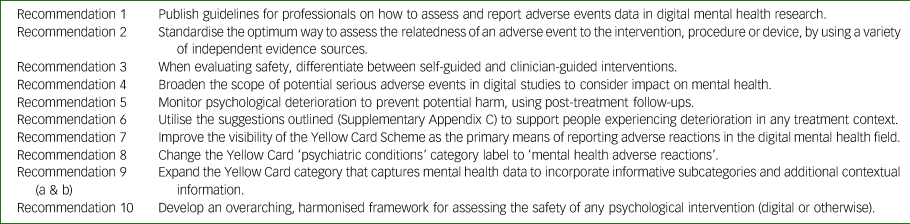 Perhaps one of the reasons why it has been difficult to adapt the medical model for DMHIs is that this model was not developed to assess the safety of face-to-face psychological therapies. The current quality of adverse event reporting in trials of face-to-face interventions is poor and is not subject to the same regulation as medical devices.Reference Linden12 Face-to-face interventions would also benefit from a standardised safety assessment method. Currently there is insufficient information about how the negative effects or adverse events data of face-to-face and DMHIs compare.Reference Rozental, Andersson, Boettcher, Ebert, Cuijpers and Knaevelsrud13 An ideal solution would be to develop one harmonised approach to assess the safety of face-to-face and DMHIs (recommendation 10). One harmonised approach could enhance the quality of safety assessments in traditional face-to-face interventions and ensure that safety evaluations of DMHIs are appropriate, proportionate and effective. Whether it is plausible to meet the needs of statutory regulators, clinicians, researchers, manufacturers and other stakeholders within a single overarching framework remains to be seen. Nevertheless, possible benefits our experts highlighted included better quality safety data, a more accessible method for non-medical mental health practitioners and better safety standards for both face-to-face and DMHIs.