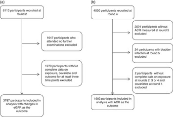 For the analysis with changes in eGFR as the outcome, we included those who responded to R2 in 1993–1997 (n 6113), because data on diet and eGFR were not available before 1993. For the analysis with ACR as the outcome, we included those who responded to R4 in 2003–2007 (n 4520), and who had ACR measured in R5 in 2008–2011, giving a total of 1929 participants. ACR data were not available before 2008 and after 2012. Pregnant women were censored at the round in which they reported to be pregnant. Furthermore, for both analyses we excluded participants as indicated in Fig. 1.