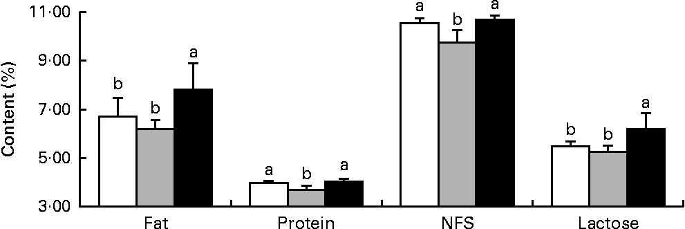 Milk fat and lactose contents were higher (P< 0·05) in the HMTBA-fed sows than in the CON-fed and DLM-fed sows, whereas milk protein and non-fat solid contents were lower (P< 0·05) in the DLM-fed sows than in the CON-fed and HMTBA-fed sows at 14 d post-partum (Fig. 1).