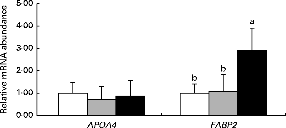 ) diets. Values are means (n 6), with standard deviations represented by vertical bars. a,bMean values with unlike letters were significantly different (P< 0·05). APOA4, apoA-IV; FABP2, fatty acid-binding protein 2.