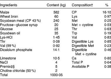 § Provided per kg of diet: Cu, 10 mg; Fe, 120 mg; Mn, 30 mg; Zn, 80 mg; I, 0·21 mg; Se, 0·23 mg; antioxidant, 100 mg; anti-mould additive, 500 mg.