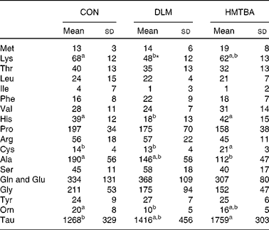 Table 3 presents milk AA concentrations in sows fed the CON, DLM or HMTBA diet at day 14 post-partum. Milk lysine concentration in the DLM-fed sows was lower (P< 0·05) than that in the CON-fed sows and tended (P< 0·10) to be lower than that in the HMTBA-fed sows. Milk histidine concentration was lower (P< 0·05) in the DLM-fed sows than in the CON-fed and HMTBA-fed sows. The DLM-fed sows also had lower (P< 0·05) ornithine concentration than the CON-fed sows. The HMTBA-fed sows had higher taurine (P< 0·05) concentration, but lower (P< 0·05) alanine concentration than the CON-fed sows. Milk cysteine concentration was higher (P< 0·05) in the HMTBA-fed sows than in the CON-fed and DLM-fed sows.
