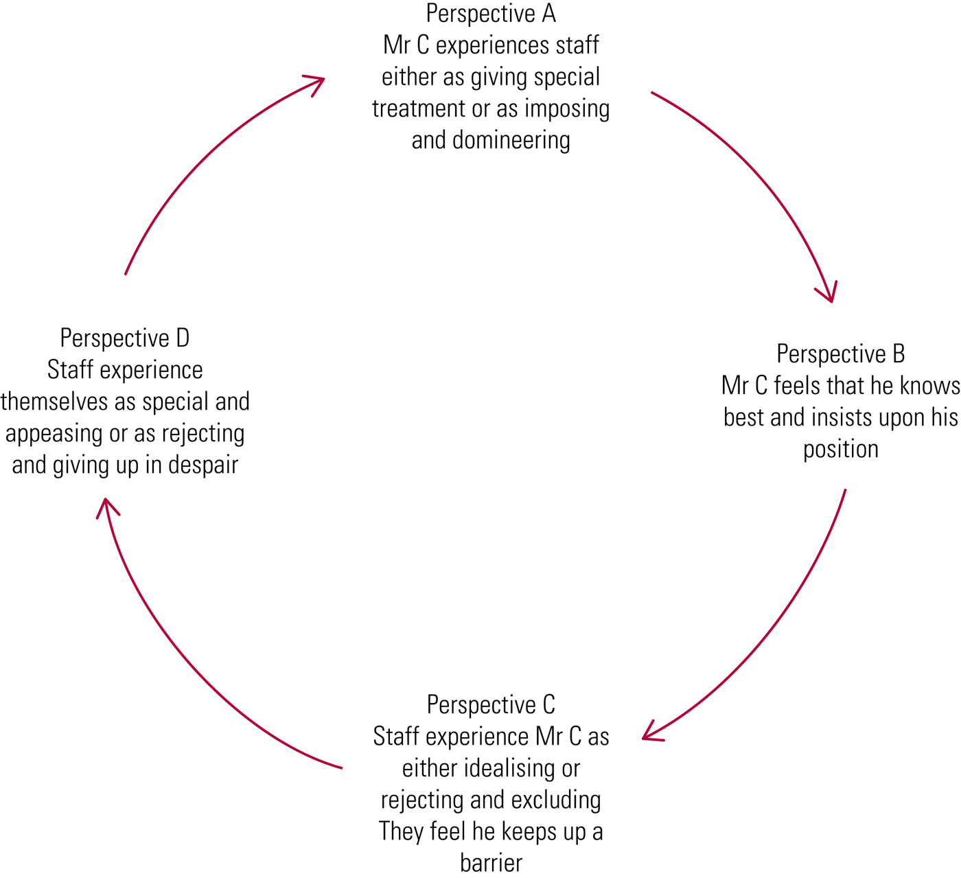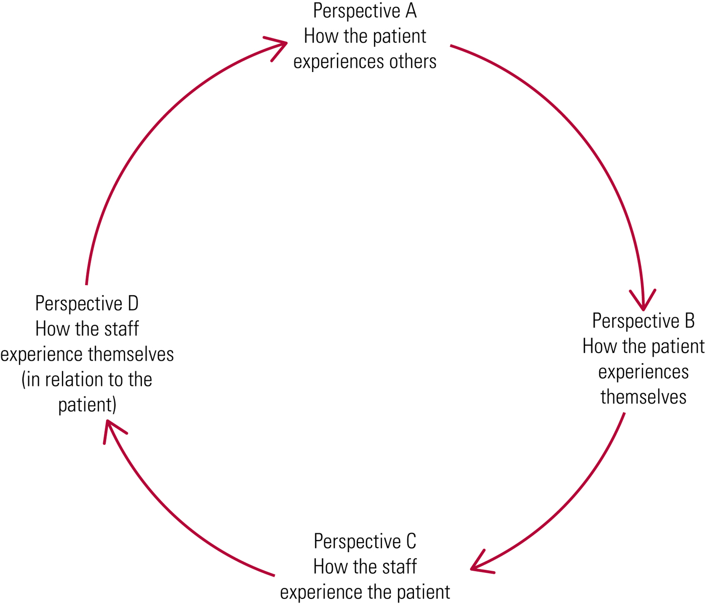 After working through the four perspectives, the team are helped to synthesise a formulation describing how these perspectives may interrelate in a dysfunctional and repeating cycle (denoted by the arrows in Fig. 1) into which patients and staff are drawn. From here, an extended formulation brings in what is known about the patient's history. This allows exploration of how the patterns of relating forged from significant past relationships are being played out with the team members caring for them in the present.