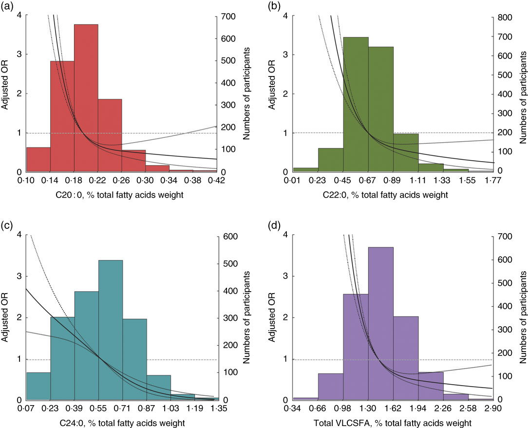 Fig. 1 Risk of the metabolic syndrome by very-long-chain SFA (VLCSFA) levels at baseline. Lines represent OR (95 % CI) based on restricted cubic splines for VLCSFA levels with knots at the 5th, 50th and 95th percentiles. OR were estimated using a logistic regression model after adjustment for age, sex and agricultural work; bars represent the numbers of participants. (a) C20 : 0 (P non-linearity<0·001), (b) C22 : 0 (P non-linearity=0·002), (c) C24 : 0 (P non-linearity=0·021) and (d) total VLCSFA (P non-linearity<0·0001).