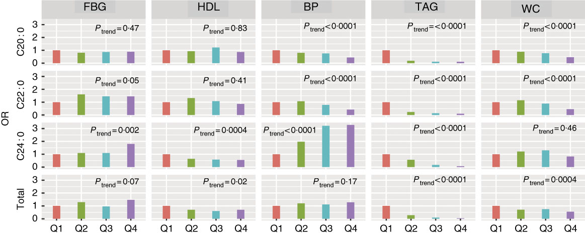 Fig. 2 Associations of very-long-chain SFA and risk of the metabolic syndrome components at baseline. Logistic regression was used to estimate the OR and CI. All the OR were adjusted for age, sex and agricultural work. The five components were adjusted in the models, except for itself. The five components were classified into high/low group according to the cut-off in the metabolic syndrome definition. BP, blood pressure; FBG, fasting blood glucose; WC, waist circumference.