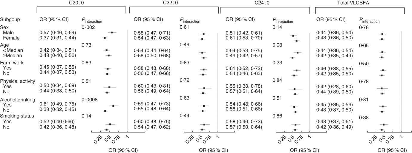 We also explored effect modification on the associations of VLCSFA and MetS risk by several a priori risk factors, including age, sex, smoking status (yes and no), current alcohol drinking (yes and no), physical activity and agricultural working (Fig. 3). The inverse associations between C20 : 0 and MetS risk were stronger in women than in men (OR=0·37 (95 % CI 0·31, 0·44) for women and OR=0·57 (95 % CI 0·46, 0·69) for men; P for interaction=0·002) and in non-alcohol drinkers than in current alcohol drinkers (OR=0·38 (95 % CI 0·32, 0·45) for non-alcohol drinkers and OR=0·61 (95 % CI 0·49, 0·75) for current alcohol drinkers; P for interaction=0·0008) (Fig. 3).