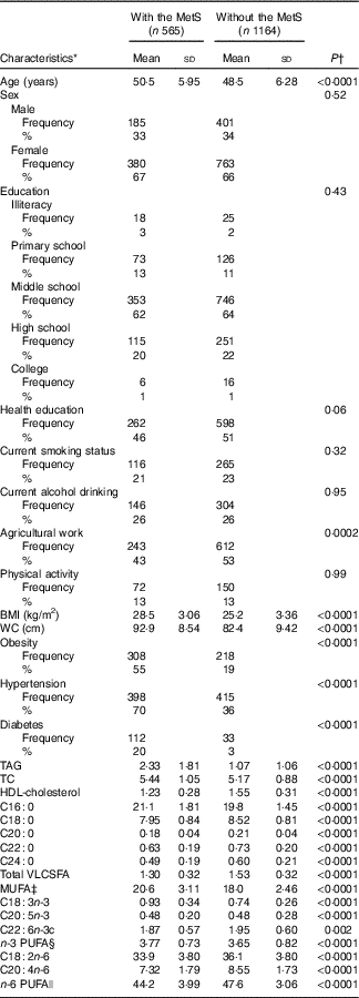A total of 1729 participants were included in this study; 565(32·7 %) of these were identified as the MetS at baseline. Baseline characteristics of participants with or without the MetS were presented in Table 1. The two groups were similar in sex, smoking status, alcohol drinking and physical activity. Compared with participants without the MetS, the MetS participants were older and did less agricultural work. The MetS group had lower level of plasma C18 : 0, C20 : 0, C22 : 0, C24 : 0, C22 : 6n-3, C18 : 2n-6, C20 : 4n-6 and n-6 PUFA, but had higher C16 : 0, MUFA, C18 : 3n-3, C20 : 5n-3 and n-3 PUFA. Women and individuals without diabetes had higher levels VLCSFA (online Supplementary Tables S1a and S1b). In addition, higher VLCSFA were associated with lower BMI, lower TAG and higher HDL. Participants with higher levels of C20 : 0 or C22 : 0 tended to be non-smoker and non-alcohol drinker, do more agricultural work, have no hypertension and have lower WC and cholesterol (online Supplementary Table S1a). Furthermore, older ages were inversely related to higher C20 : 0, but directly to higher C24 : 0 (online Supplementary Tables S1a and S1b). Participants with higher C24 : 0 were more likely to have hypertension (online Supplementary Table S1b).