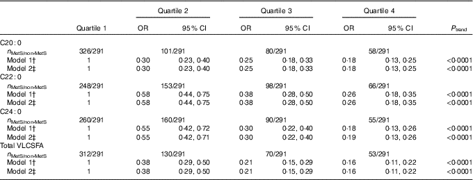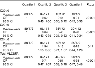 * Logistic regression was used to estimate the OR and CI. VLCSFA were classified into four group based on the quartiles of VLCSFA in subjects without the metabolic syndrome: 0·18, 0·20 and 0·23 for C20 : 0; 0·59, 0·70 and 0·84 for C22 : 0; 0·46, 0·61 and 0·73 for C24 : 0; 1·32, 1·51 and 1·72 for total VLCSFA.