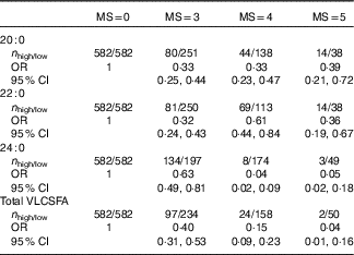 Table 3 Associations of very-long-chain SFA (VLCSFA) and risk of the metabolic syndrome (MS) according to the number of MS components at baseline* (Odds ratios and 95 % confidence intervals)