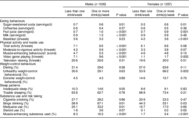 For males and females, weekly sports drink consumption was significantly associated with higher consumption of sugar-sweetened soda (both P=0·01) and 100 % fruit juice (P<0·001 and P=0·001, respectively), higher video game use (P<0·001 and P=0·002, respectively), binge drinking (P=0·01 and P=0·03, respectively) and use of muscle-enhancing substances (both P<0·001; Table 2). The observed difference in video game use was particularly notable for males, with those who consumed sports drinks weekly spending an average of 2·5 additional hours per week playing video games compared with males who consumed sports drinks less than once weekly. Among males only, weekly sports drink consumption was also significantly associated with higher milk consumption (P<0·001), higher total and moderate-to-vigorous physical activity (both P<0·001), higher use of muscle-enhancing behaviours (P<0·001) and marijuana use (P=0·01). Among females only, weekly sports drink consumption was significantly associated with less frequent breakfast consumption (P<0·001) and use of unhealthy weight-control behaviours (P=0·003). Similar patterns were observed for males and females in models of substance-use behaviours that additionally accounted for sensation-seeking behaviour, with only two notable exceptions (data not shown). Among females, the relationship between weekly sports drink consumption and binge drinking was attenuated and no longer statistically significant (P=0·07) while an association with steroid use emerged (P=0·02).