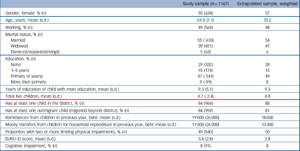 First, households sending a large proportion of migrants may have advantages at outset from households from where migration is less common. Migration is known to be a ‘selective process’, described as movement of the ‘brightest’ and more advantaged. Reference Skeldon24 In our study, parents with all children migrated were more likely to be male, better educated and married – all variables that would reduce risk for depression – and to have better educated children. Households enabling all children to migrate may have greater personal resources, for example facilitating social networks for their children in the destination area. Although migration can be a response to poverty it is also a search for prosperity by those coming from households able to take up the challenge. Rather than seeing the left behind as ‘passive recipients’ Reference Toyota, Yeoh and Nguyen25 it is likely that they contributed to the decision to migrate as part of family diversification. In contrast having few children migrate could be linked to failed aspirations, increasing the risk for family conflict and parental depression. It is notable that well-planned migration, including family involvement, has been associated with better mental health in Irish migrants to the UK. Reference Ryan, Leavey, Golden, Blizard and King26 Furthermore, in the Thai context, migrant households adapted to separation by keeping contact through telephones (increasingly available and affordable and often shared with relatives and neighbours) and through short visits at crucial times. These approaches enabled children to respond to emergency situations. Although parents with all children migrated received less overall social support from children, they were as likely to perceive very adequate support from children and more likely to receive support from others. Many older people continued to live with a grandchild, which has been shown to be protective against depression in China. Reference Silverstein, Cong and Li27 For special festivals it was standard for children to travel back for 24 h. Knodel has called this ‘the modified extended family’, which he describes as dynamic and unbound by the ‘solid traditional family structure relationship’, with parents linked into their children's migration processes. Reference Knodel and Saengtienchai5