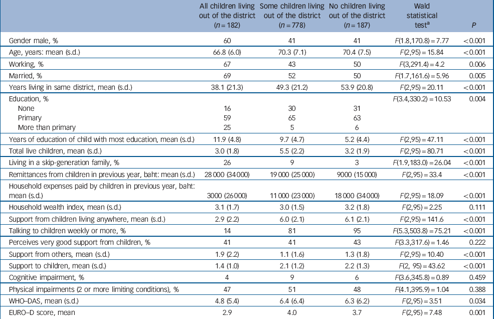 | Support from children living anywhere, mean (s.d.) | 2.9 (2.2) | 6.0 (2.1) | 6.1 (2.1) | F(2,95) = 141.6 | <0.001 |