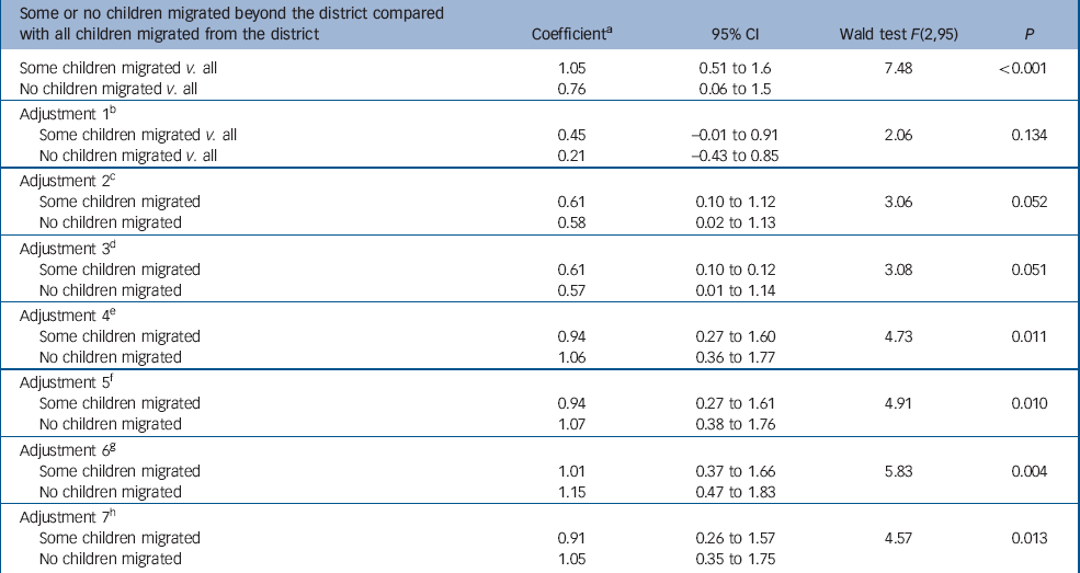 | Some or no children migrated beyond the district compared with all children migrated from the district | Coefficienta | 95% CI | Wald test F(2,95) | P |