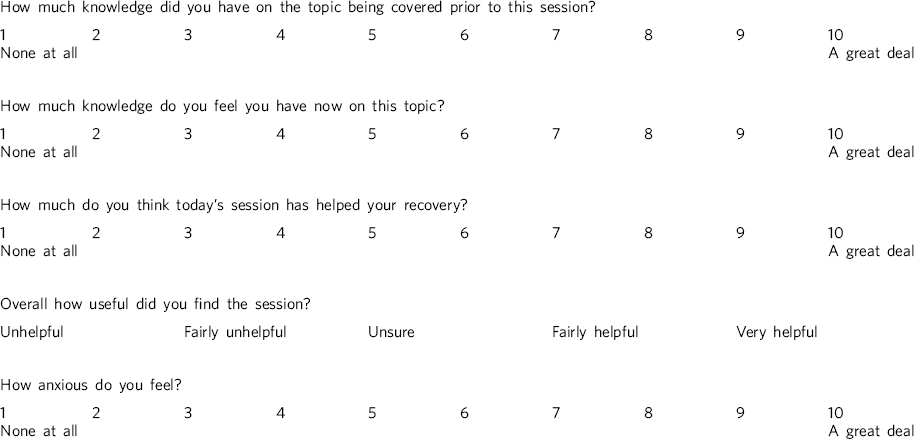 The questionnaire was developed by the group facilitator (a clinical psychologist) based on the questionnaire used by the authors of MCT. Reference Moritz and Woodward5 It took approximately 5 min to complete and covered demographic information, questions that created a unique anonymised code to track participants through the programme and questions providing quantitative data on either a five-point or ten-point Likert scale (Appendix).