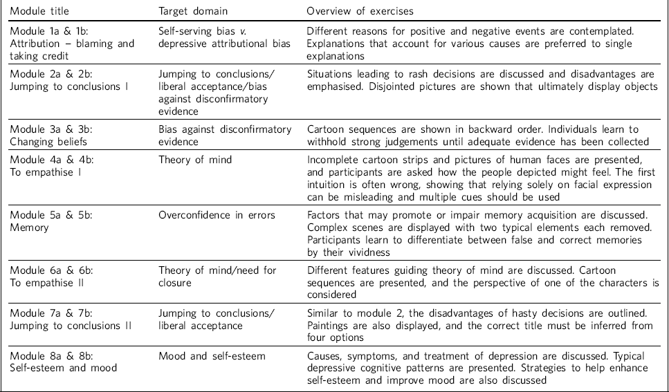 target domain (for example jumping to conclusions, attributional style), using everyday examples and illustrations projected from a computer screen. Two cycles of the programme were available; each cycle involved the same targets but with different group exercises. It was an open group that individuals could join at any time. The manual, modules and other resources were downloaded cost-free from www.uke.de/mct. Table 1 outlines the content of the group programme. Reference Moritz and Woodward11