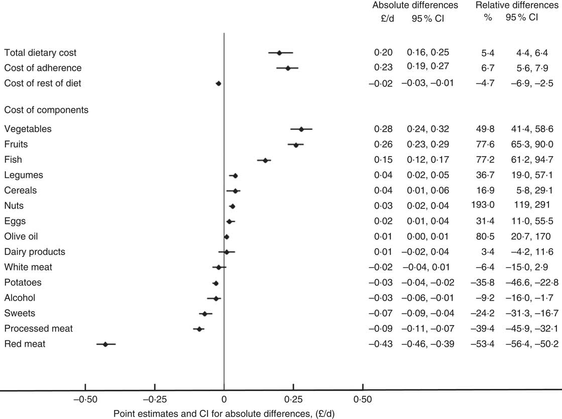 Figure 1 Absolute and relative differences in cost of total diet and dietary components comparing high (top third) and low adherence (bottom third) to the Mediterranean diet in the Fenland Study. Point estimates and CI shown are for absolute differences. All estimates based on single imputed dataset, after confirming no difference in β-coefficients between single and multiple (ten) imputations. Cost of adherence refers to total cost for all components included in the score of adherence to the Mediterranean diet (i.e. sum of dietary components listed); cost of rest of diet refers to any food items not included in the adherence score.