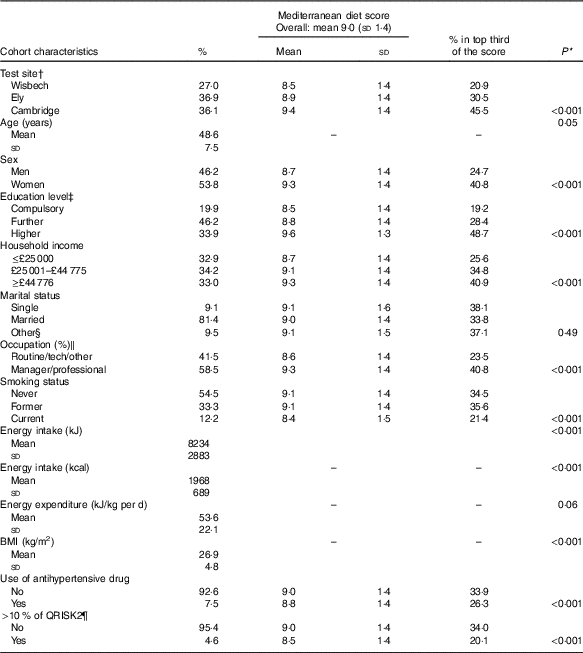 Table 1 Cohort characteristics and Mediterranean diet adherence in the Fenland Study (Mean values and standard deviations; n 12 417)