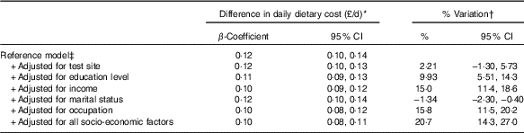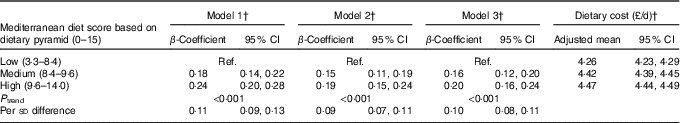 * β-Coefficients from linear regression for daily dietary cost (£/d) per sd of Mediterranean diet score estimated based on ten imputations.