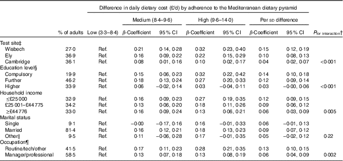 * β-Coefficients from linear regression for daily dietary cost (£/d) by adherence to the Mediterranean dietary pyramid estimated based on ten imputations. Daily dietary cost and dietary intake were adjusted to a 8368 kJ/d (2000 kcal/d) diet using the residual method. All estimates were adjusted for age, sex, objectively measured physical activity (energy expenditure), smoking status and BMI, and for socio-economic variables including education level, household income, marital status, test site and occupation, with exception for the stratified variable. Strata were defined based on non-imputed data.