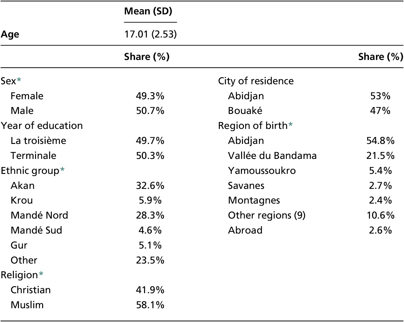 * Percentages exclude missing responses (Sex: 11; Religion: 39; Ethnic group: 85; Region: 58)
