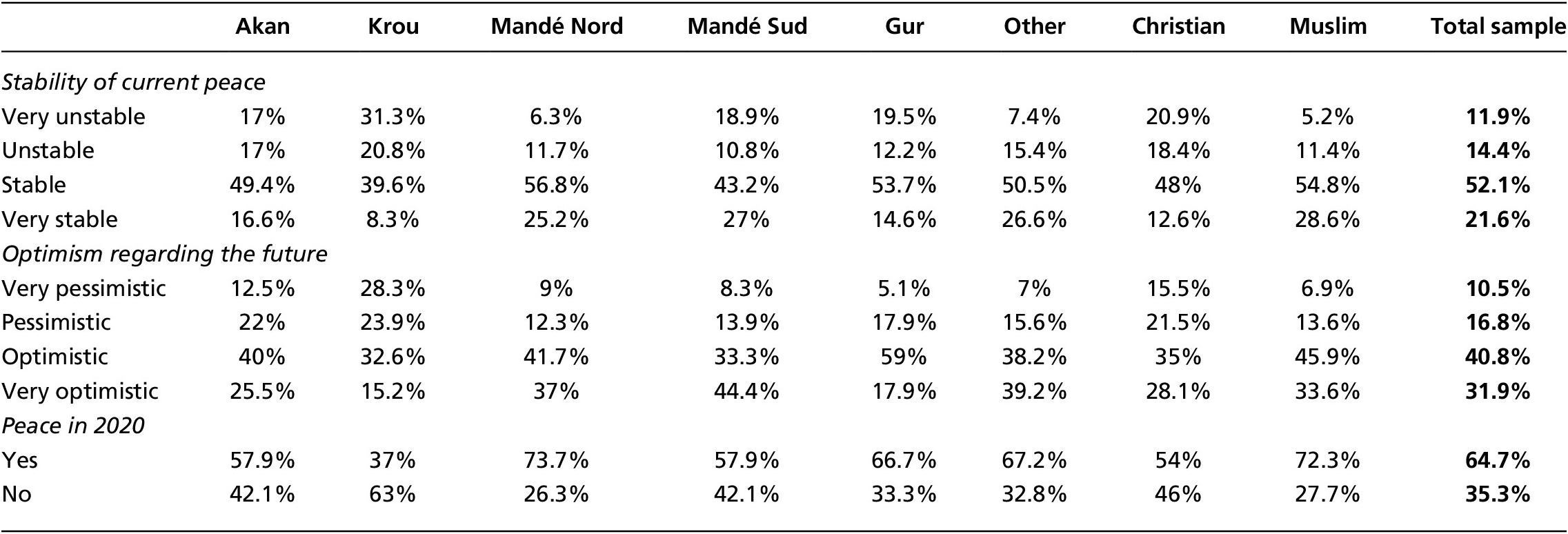 Whereas there are no significant differences between male and female adolescents in this respect, older students (often overage for their grade) were marginally more pessimistic regarding Côte d’Ivoire’s future than their younger peers.Footnote 13 Furthermore, we found evidence of a weak, yet significant, association between religious background and students’ assessment of the 2017 peace dividend (Kendall’s τb = –0.270, p<0.001; reference group: Muslims), students’ optimism regarding the future (Kendall’s τb = –0.134, p<0.001; reference group: Muslims) and their belief in a stable peace after the 2020 elections (r = –0.189, p<0.001 reference group: Muslims). More specifically, 37 percent of Christian students were “very” pessimistic regarding the future, compared to only 20.5 percent of Muslim students. Similarly, 72.3 percent of Muslim students thought there would be peace after the 2020 elections, compared to only 54 percent of Christian adolescents. There is also a significant association between these variables and students’ ethnic groups.Footnote 14 Table 2 shows that adolescents identifying as Krou—the ethnic background of ex-president Laurent Gbagbo—were particularly negative regarding the 2017 peace dividend and the future of peace, whereas ethnic groups of northern origins (Mandé Nord, Gur, other) were notably more positive. Although identities are more fluid, it is important to note here that there was a strong association between ethnic and religious group belonging (Cramer’s V = 0.710, p <0.001), with the Akan and Krou ethnic groups being predominantly Christian and the other groups being predominantly Muslim. Similar dynamics can be observed in the Afrobarometer data.