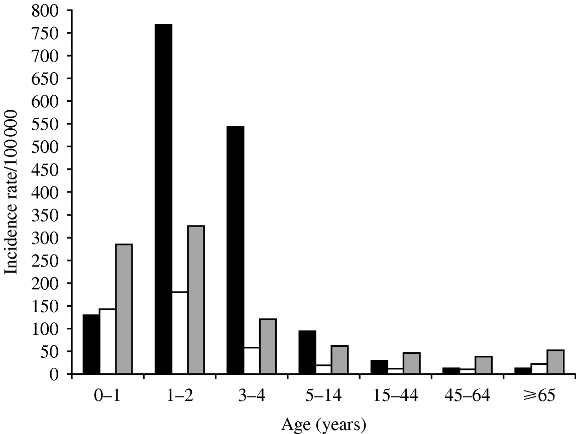 Fig 2. Age-specific reported incidence rates (per 100 000) of infection with bacterial enteric pathogens [Shigella (▪), Salmonella (□), Campylobacter ()] in the Jerusalem district, Israel, 1990–2007.