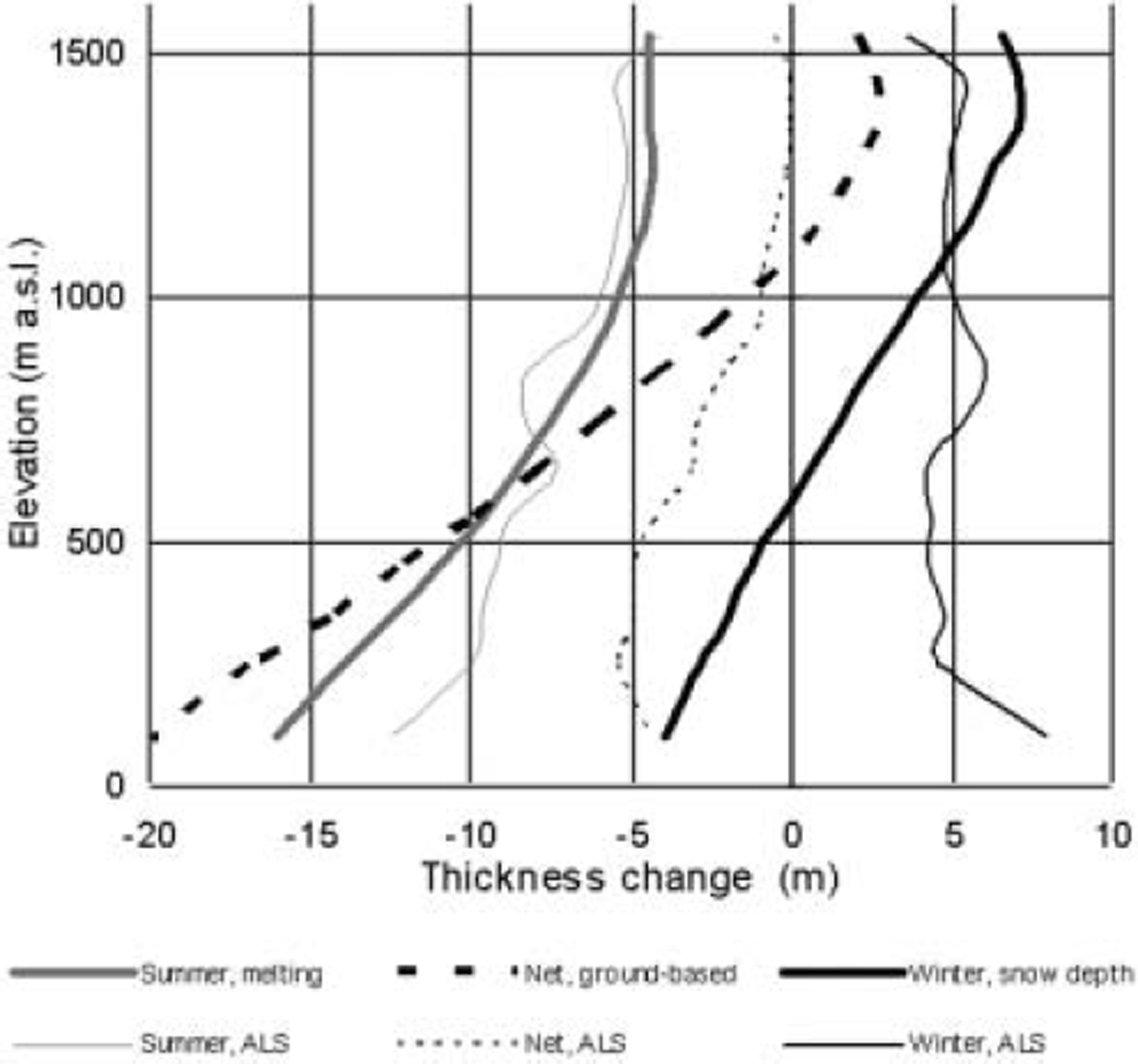 The winter term is negative below 600 m a.s.l. due to net glacier melting in this area during the winter (mainly in late autumn and spring). The average thickness change from measured snow depth and ice melting was 5.4 ±0.4 m, corresponding to a volume change of (220 ±20) × 106m3. The average thickness change from melting of snow, firn and ice for the summer term was -5.0 ± 0.6 m, corresponding to a volume change of (−200 ±20) × 106m3. The net balance curve shows positive values above 1100 ma.s.l. which correspond well to the observed position of the transient snowline on 23 August 2002. The average net thickness change for Engabreen was 0.4 ± 0.7 m, and consequently the volume change was 20 ± 30 × 106 m3.