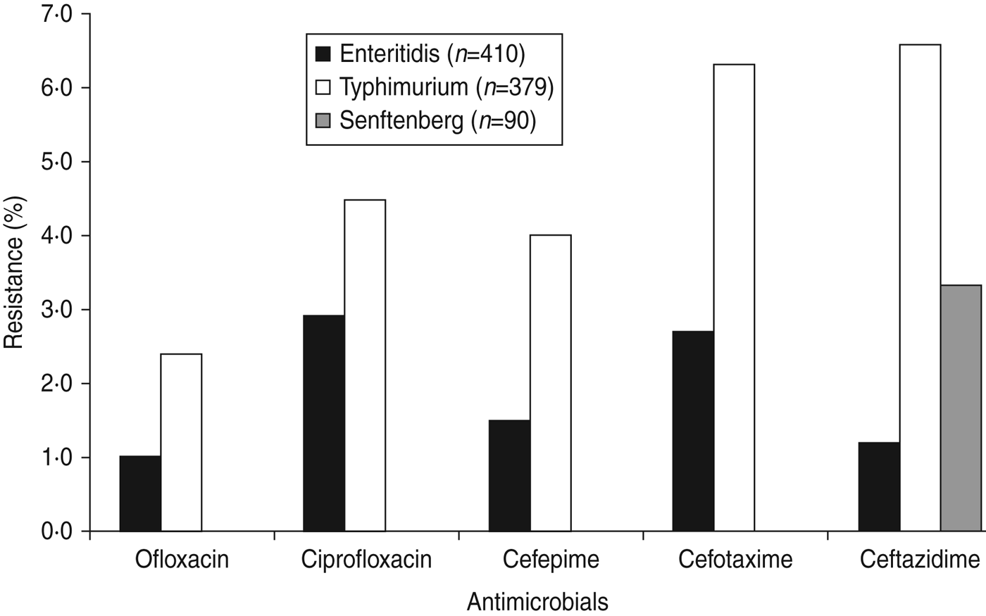 Cephalosporins are among the most diverse classes of antimicrobials, and are grouped into ‘generations’ by their antimicrobial properties. Each generation has a broader spectrum of activity than a previous one. Resistance to these drugs has been reported in several countries, albeit at a relatively low rate [Reference Torpdahl26, 27]. Unfortunately, the present study revealed the emergence of co-resistance to fluoroquinolones (ciprofloxacin and ofloxacin), and third-generation (ceftazidime and cefotaxime) and fourth-generation (cefepime) cephalosporins in Enteritidis and Typhimurium isolates. These drugs are among the most widely used worldwide, and are considered critically important in human medicine according to WHO criteria [Reference Paterson and Bonomo32] as they are reserved for use in the hospital setting to treat patients with serious and life-threatening infections. The emergence and increased resistance rates to these drugs is therefore particularly alarming. Our findings support the need of continuing active surveillance of antimicrobial resistance in Salmonella and other bacterial pathogens as it is essential to the safe and effective use of antimicrobial drugs for humans thereby protecting public health.