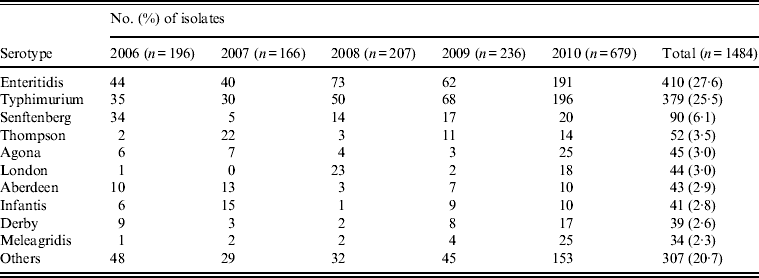 Between January 2006 and December 2010, a total of 18 000 stool specimens were cultured from patients with diarrohea in Shanghai, resulting in 1484 (8·2%) Salmonella isolates. The number of isolates per annum ranged from 166 to 679 over the sample period (Table 1). Seventy serovars were identified with 10 serovars accounting for nearly 80% (1177) of the isolates, chief of which were Enteritidis (410, 27·6%), Typhimurium (379, 25·5%), Senftenberg (90, 6·1%), Thompson (52, 3·5%), and Agona (45, 3·0%). The other 60 serovars were distributed among the remaining 307 isolates (Table 1).