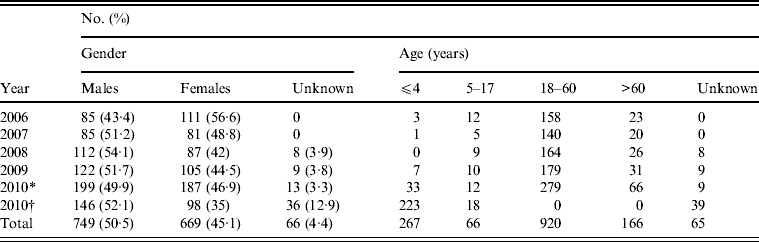 The age range of patients spanned from 2 days to 91 years. Of 1204 isolates from 2006 to 2010 (except those from Shanghai Children's Hospital and Children's Hospital of Fudan University), 76·4% were from adults aged 18–60 years. However, most isolates (79·6%) from Shanghai Children's Hospital and Children's Hospital of Fudan University in 2010 were recovered from children aged <4 years (Table 2). The male/female ratio of positive isolation was 1·1:1.