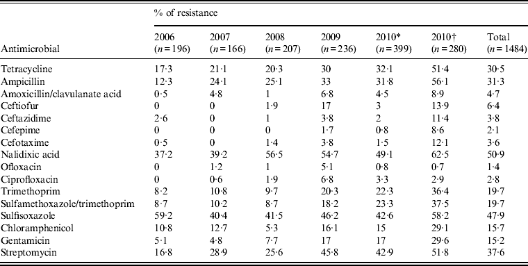Table 3. Antimicrobial resistance of Salmonella isolates from humans in Shanghai, China, 2006–2010