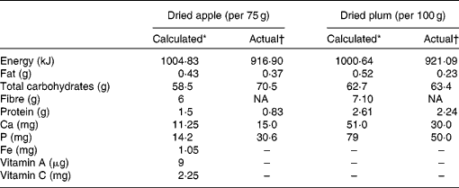 Table 1 Nutrient concentration of dried apple and dried plum obtained by both calculation and actual analyses